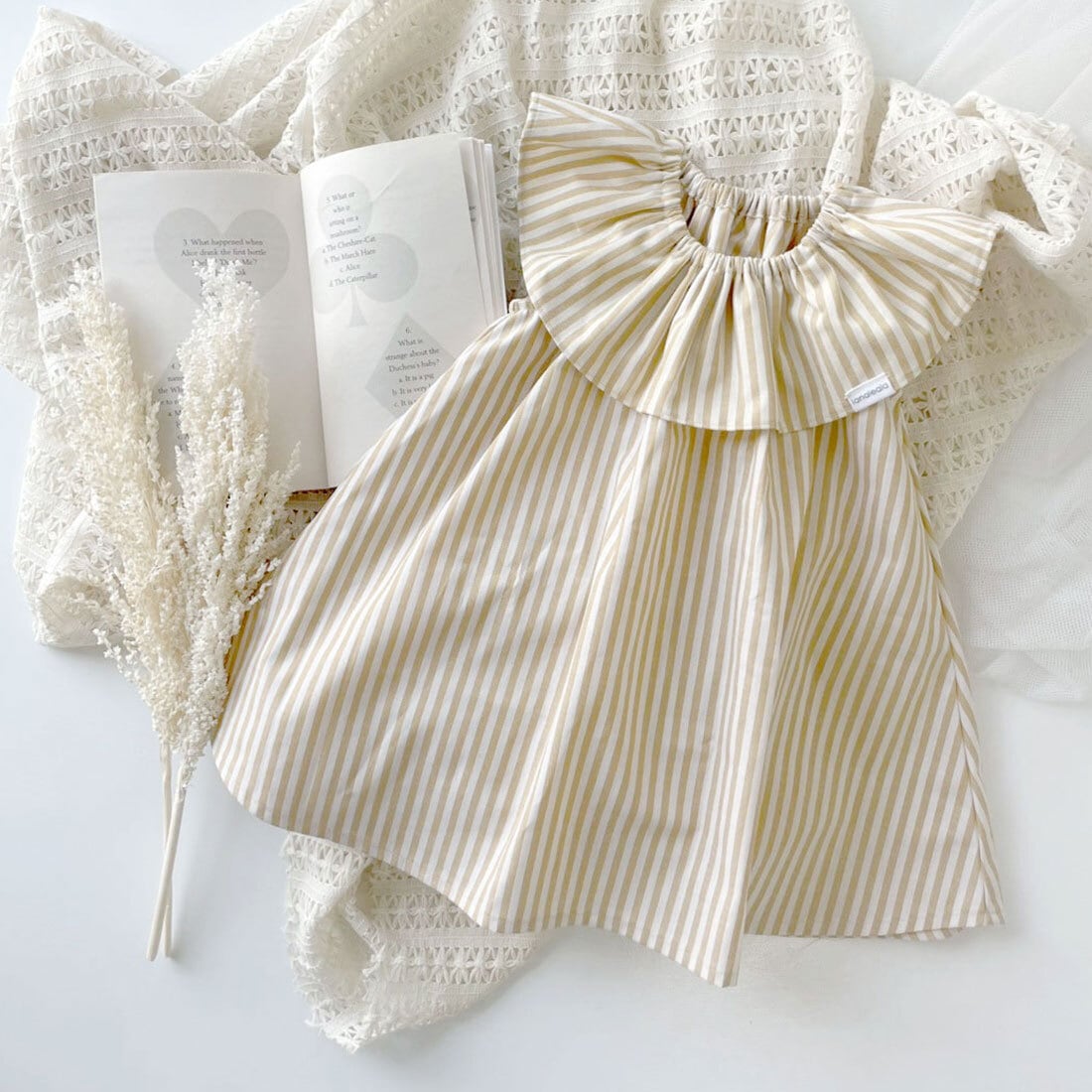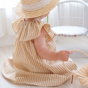 素材は軽やかで涼しく、夏の肌にも心地よいコットン100%. 動くたびにさらりと風をはらんで、小さなからだをやさしく包み込みます. 首まわりのフリルで華やか見え、ストンと着るだけで完成するAラインのシルエット.