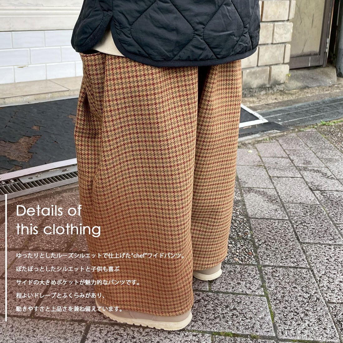 クラシックな雰囲気漂うガングラブチェックを、ゆったりとしたルーズシルエットで仕上げた“chef”ワイドパンツ。毎日のコーデに取り入れやすいシンプルさと、秋冬らしい素材感の両方が叶う、lanalealaイチ押しの一本です。